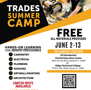 Lakeland, FL - (February 19, 2025) - This summer, the Lakeland Police Department is proud to partner with the Polk County School Board and the Polk County Sheriff's Office to offer a FREE camp with industry professionals to teach skills needed in vocational job markets. Students will have hands-on sessions to learn more about: