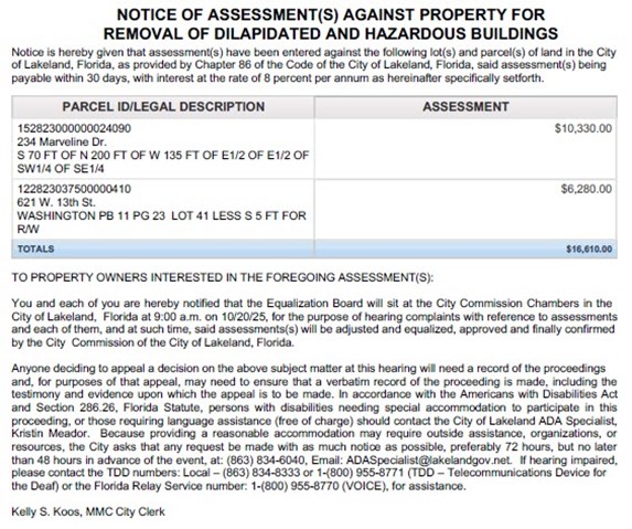 Legal Notice: Assessment(s) Against Property for Removal of Dilapidated & Hazardous Buildings