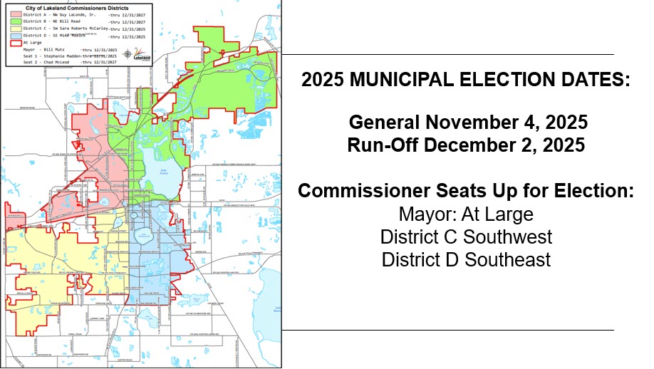 The successful candidates will take office the first meeting in January 2026. Candidates must be city residents and shall sign up by filing the appropriate paperwork with the City Clerk at City Hall, in accordance with applicable law.  Forms are available immediately.  Please call (863)834-6210 for an appointment.  Additional information is available at www.lakelandgov.net.  Look for Elections & Voting under the City Government tab.
