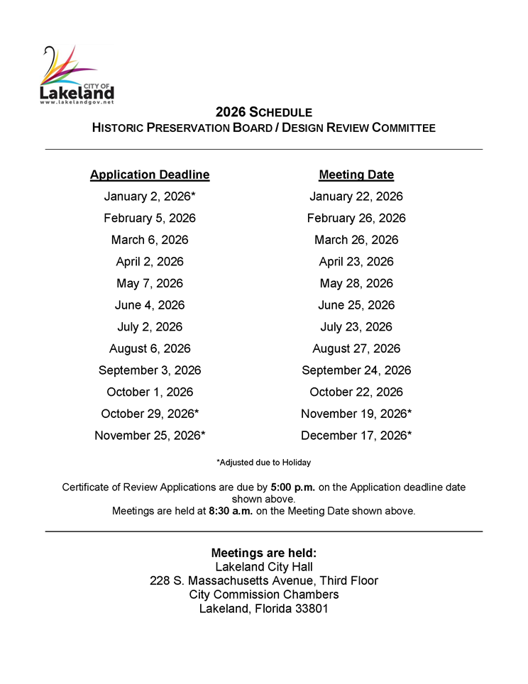 Minutes from past meetings can be requested from the Historic Preservation office via email: Emily.Foster@LakelandGov.net