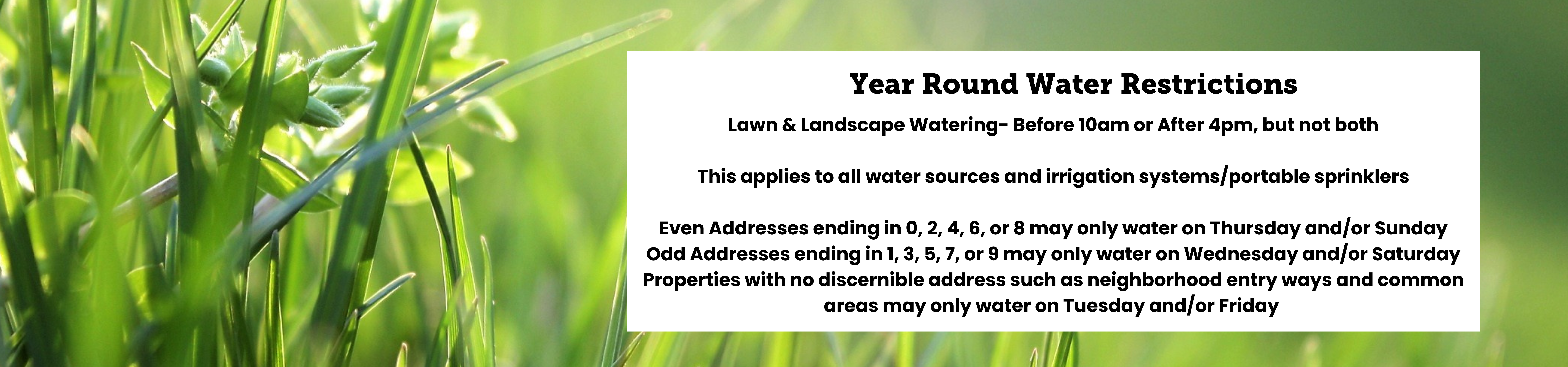 Watering in of pesticides and fertilizers as required by the manufacturer of the product is allowed on any day. However, signs must be posted on the lawn and the date of the application must be written clearly on the sign (See sample below). These applications are not restricted to the appointed irrigation day, but it is recommended to plan applications around your irrigation schedule (not rain events).