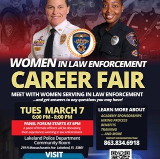 The first Career Fair, focused on Women in Law Enforcement, will be held on Tuesday, March 7, 2023, from 6:00 p.m. until 8:00 p.m. The event will take place in the Community Room at the Lakeland Police Station, 219 North Massachusetts Avenue in Lakeland. At 6:00 p.m., there will be a panel discussion with some of our female officers who will share their personal experiences while serving in law enforcement and answer any questions from guests. (View event flyer)