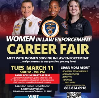 LAKELAND, FL (March 8, 2025) - The Lakeland Police Department will host a career fair for those interested in an exciting and purpose-driven career in either law enforcement or a civilian career as a Public Safety Aide or in our 911 Emergency Communications Center. The event will take place Tuesday, March 11, 2025, from 5:00 p.m. until 7:00 p.m. in the Community Room at the Lakeland Police Station, 219 North Massachusetts Avenue in Lakeland.