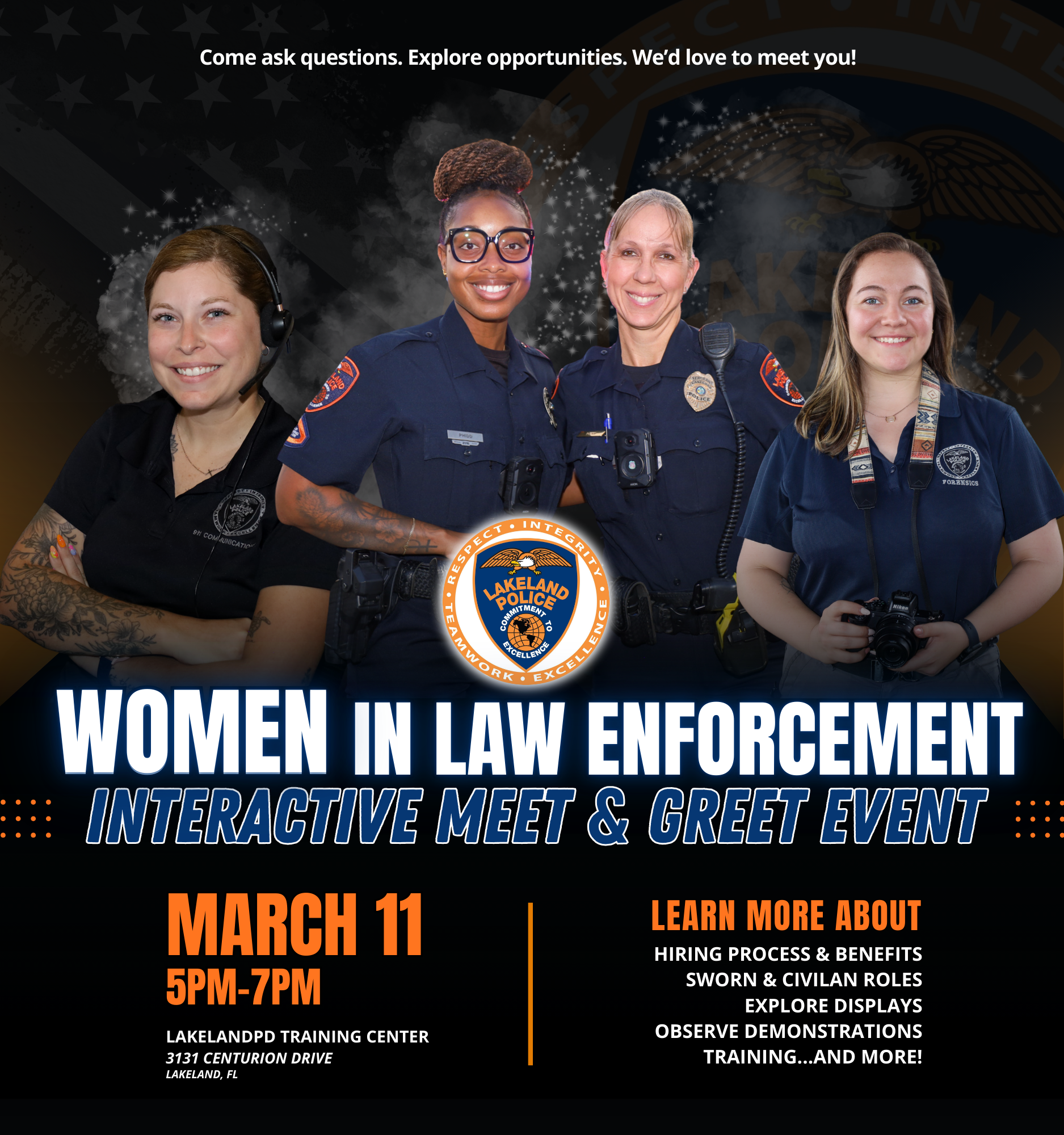 This interactive meet-and-greet will showcase the women who serve across the department in both sworn and civilian professional roles — representing the strength and diversity of the Lakeland community through a broad range of backgrounds, experiences, and life journeys.
